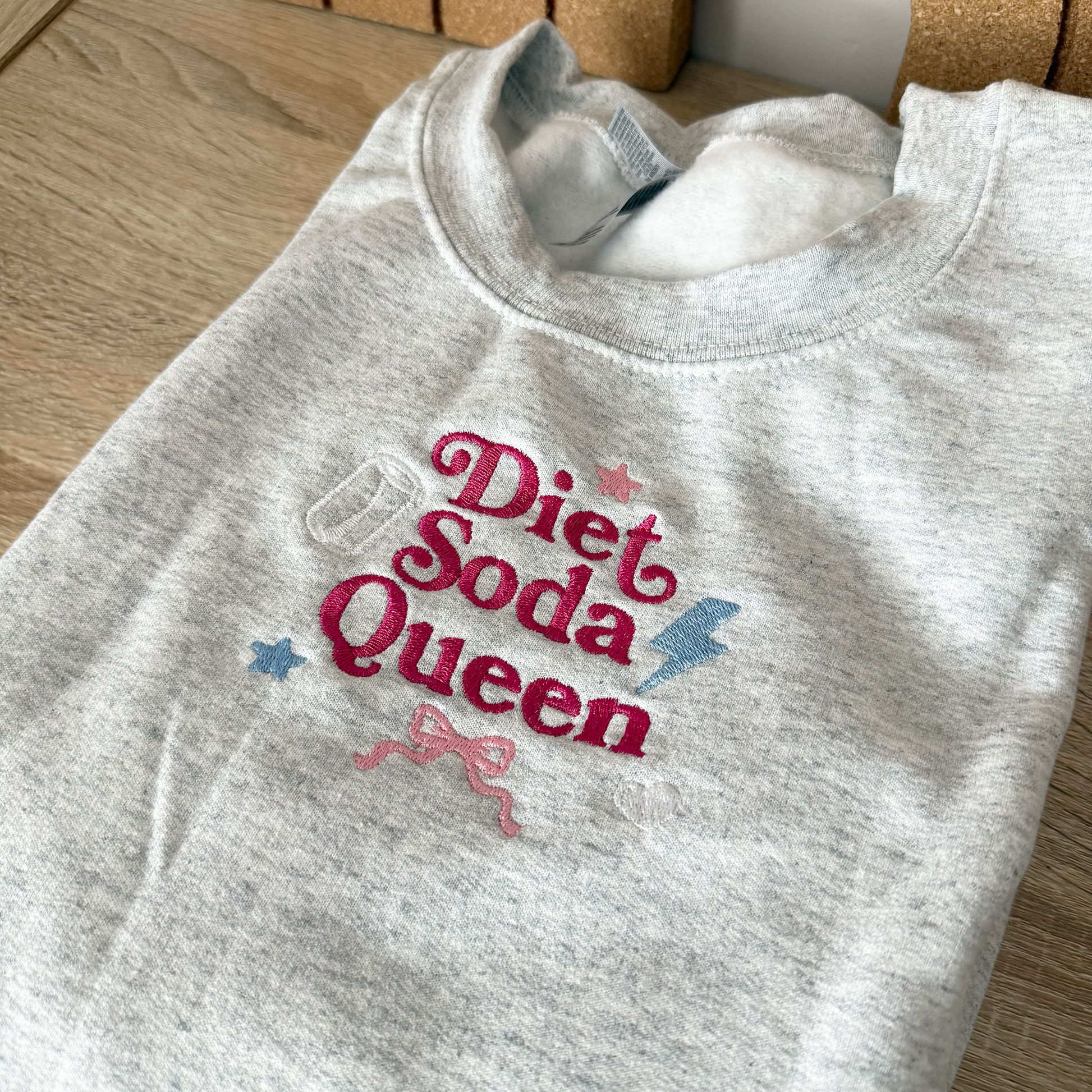 Diet Soda Queen Embroidery on an Ash Gray Gildan Crewneck Sweatshirt.